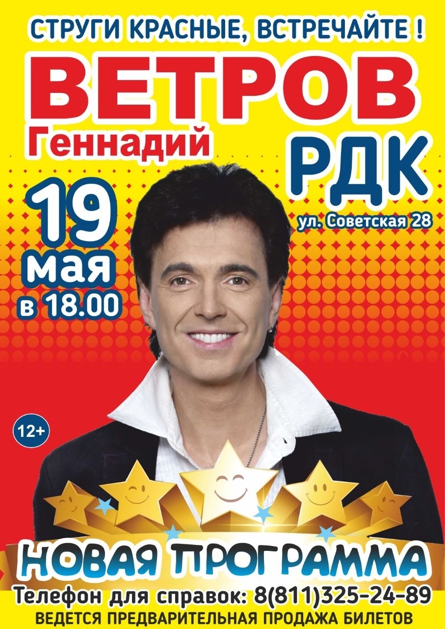 Юмористический вечер Геннадия Ветрова - это разговор артиста со зрителем о разных гранях юмористической палитры, это неожиданные музыкальные инструменты и новое музыкальное оформление программы, новые монологи и пародии и, конечно же, юмористический хит парад любимых поклонниками номеров. Концерт Геннадия Ветрова — это возможность от души посмеяться над собой, обществом и нашей жизнью. Его миниатюры, всегда живые и реальные, не оставляют ни одного зрителя в зале равнодушным.